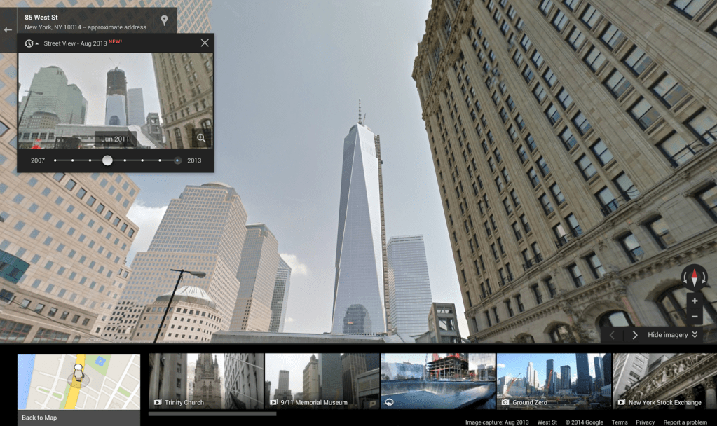 Las opción del tiempo, indica la cantidad de veces que el vehículo de Google Maps ha pasado por la zona y la ha fotografiado. Hay lugares del planeta, como la calle 85 Oeste, en Nueva York (como podemos apreciar en la imagen anterior), tiene varios ejemplos, al tiempo que otras zonas más rurales podrían haber sido visitadas sólo una vez por el llamativo vehículo de Google Maps (que podemos ver en la imagen siguiente), y que despierta curiosidad allí por donde se deja ver.