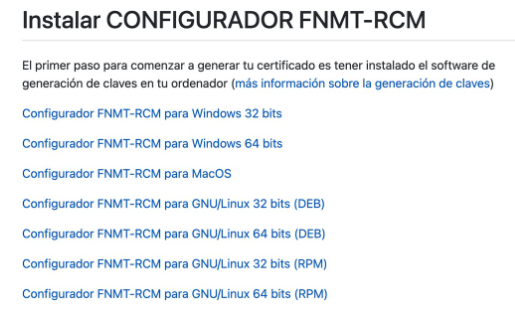 Lo primero que tendremos que hacer será instalar el programa CONFIGURADOR FNMT-RCM de la FNMT. Lo vamos a poder descargar desde el siguiente enlace. Allí encontraremos versiones para Windows de 32 y 64 bits, macOS y varias versiones de GNU/Linux.