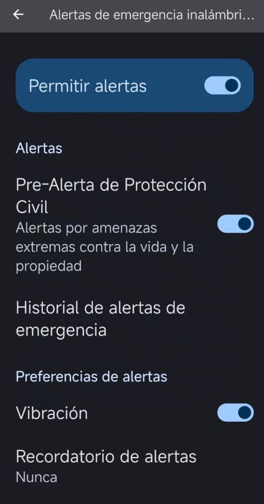 En terminales con sistema operativo Android (o personalizaciones del sistema Android por el fabricante), puede variar dependiendo del dispositivo, aunque la mayoría tienen una ruta similar. En ‘Ajustes’ tendremos que buscar ‘Seguridad y emergencias’. Es en ‘Alertas de emergencias inalámbricas’ donde podemos comprobar su activación o activarla seleccionando ‘Permitir alertas’. Es conveniente asegurarnos también, que está activado el modo vibración.