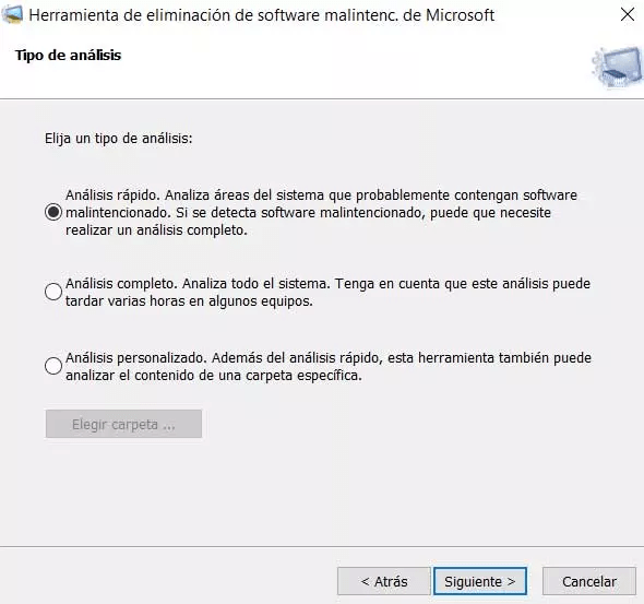 La herramienta MSRT, nos permitirá seleccionar si deseamos realizar un análisis rápido o bien, otro más completo.