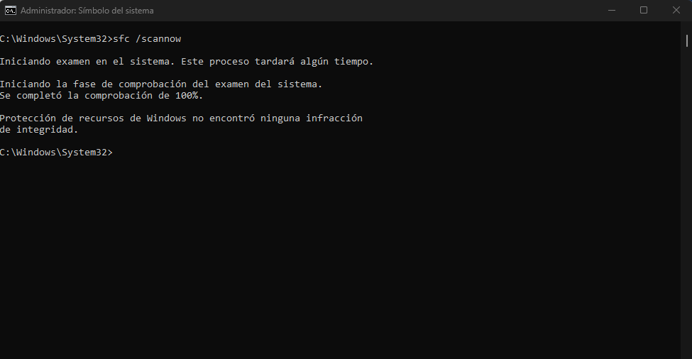 En este caso, al introducir los comandos como se puede apreciar en la imagen, el sistema realiza la comprobación y nos mostrará el resultado. En caso de encontrar algún archivo corrupto, procederá a su reparación.